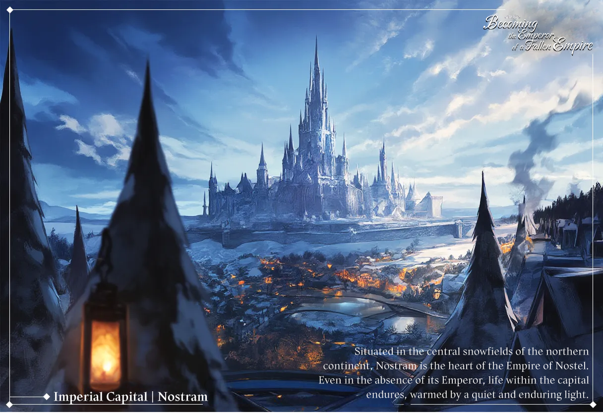 The Empire of Nostel, standing upon the snowy plains of the Northern Continent, is governed by the Emperor seated upon the Throne—an artifact capable of rewriting the laws of reality—and by the Five Great Houses, each excelling in their own distinct discipline.